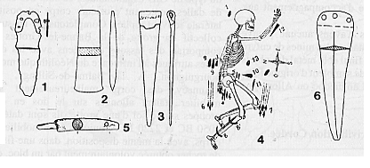 - 1: poignard ; - 2: hache plate; - 3: "pendeloque" ; - 5: retouchoir en cuivre